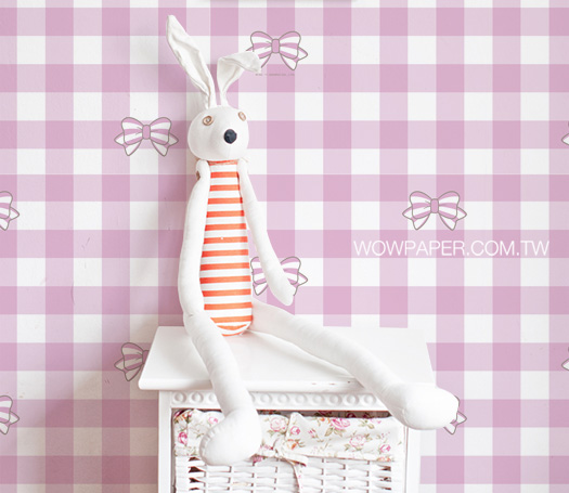 與日本三麗鷗合作生產之壁紙,底材用微顆粒質感的仿噴沙效果呈現,以可愛的著名角色美樂蒂常用色為主題,運用粉紅白色直線條紋呈現,在以粉紅、白色大蝴蝶結交錯排列,展現出俏皮可愛的設計。