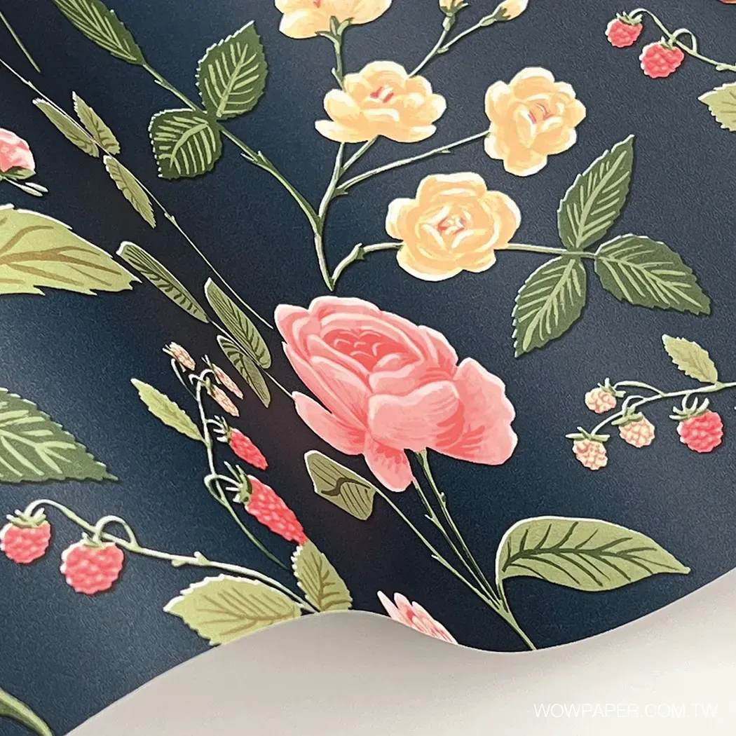 以復古植物圖畫為靈感,玫瑰是一種永恆的圖案,色彩設計上充滿了分層的細節、經典的色彩和俏皮的覆盆子莖。面料使用平滑紋理無紡紙材製造,透過質地較透氣以及表面的防水特性來達到較防潮的機能性,在遇水後不易產生纖維變形等問題。