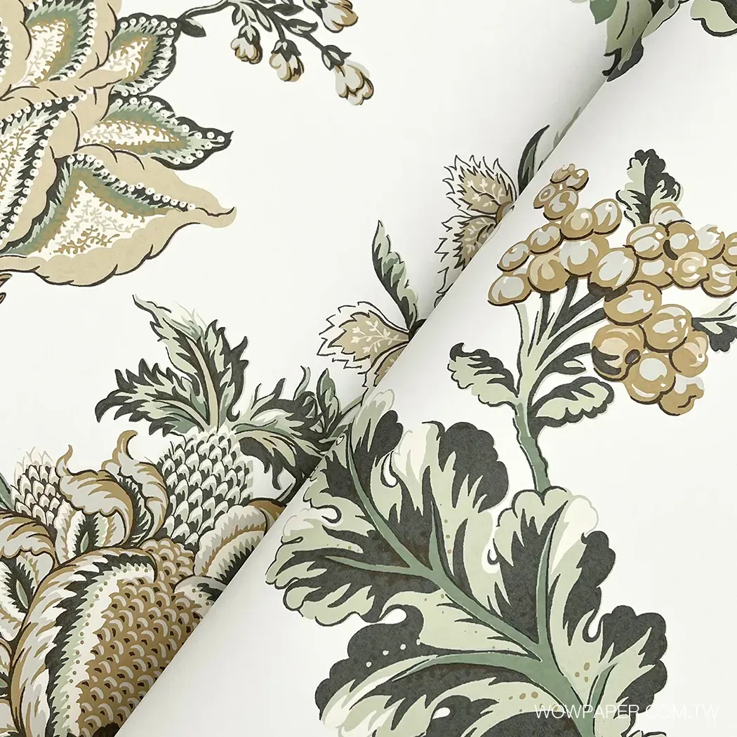 華麗的手繪葉子和繁茂多層的花朵,裝飾著令人印象深刻的詹姆士一世時期設計的蜿蜒樹枝,將永恆與現代精緻融為一體並以醒目的色調重新詮釋,柔美中帶著自信的魅力;面料使用無紡工法製造,透過質地較透氣以及纖維遇水不變形的特性來達到較防潮的機能性。