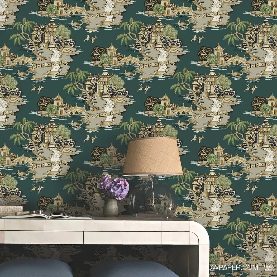 拱橋、流水與亭子被棕櫚樹和其他植物環繞著,專屬於東方文化特有的寧靜和優雅;面料使用無紡工法製造,透過質地較透氣以及纖維遇水不變形的特性來達到較防潮的機能性。