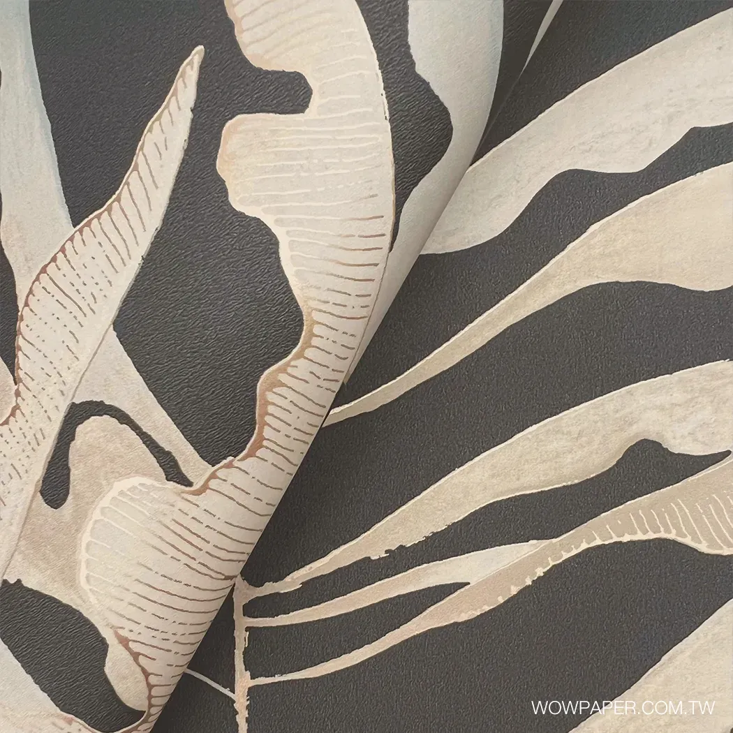 以有機的構圖原素詮釋條紋款式,細長捲曲的葉子沿著中央連接莖以輕柔的水彩色繪製,局部線條加有金色珠光點綴;面料使用無紡工法製造,透過質地較透氣以及纖維遇水不變形的特性來達到較防潮的機能性。