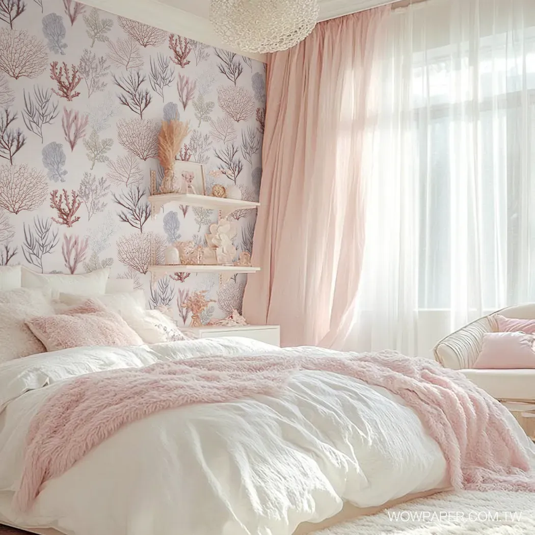 這款具細織布紋理的作品以精緻細膩的珊瑚群為設計,彷彿潛入優雅迷人的海底世界;面料使用無紡紙搭配乙烯基膜製造,透過質地纖維遇水不變形以及表面的防水特性來達到較防潮和較耐刮的機能性。