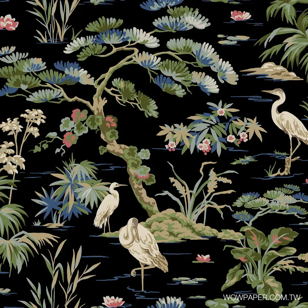 對亞洲濕地的風格化渲染中,蒼鷺和鶴棲息在蓮花和松樹之間,呈現出秀雅的東方氣息。面料使用平滑紋理無紡紙材製造,透過質地較透氣以及表面的防水特性來達到較防潮的機能性,在遇水後不易產生纖維變形等問題。