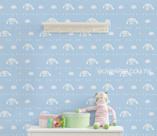 與日本三麗鷗合作生產之壁紙,底材用微顆粒質感的仿噴沙效果呈現,以可愛的著名角色大耳狗為主角,運用淡藍色為底搭配白、黃、粉紅色不規則小圓點陪襯,在以紫、粉紅色線條描繪出俏皮可愛的雲朵,用大大的耳朵吧嗒吧嗒在天空飛,十分逗趣的設計。
