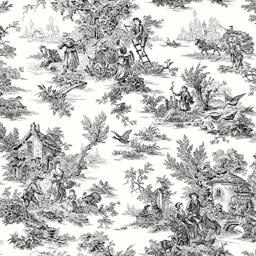 將法式茹伊印花布轉化為美麗的壁紙花色,描繪了在葡萄園裡勞動的場景。單色的線條輪廓體現出優雅的古典主義風格呈現出過去的歷史和工藝,為空間注入了永恆的魅力。