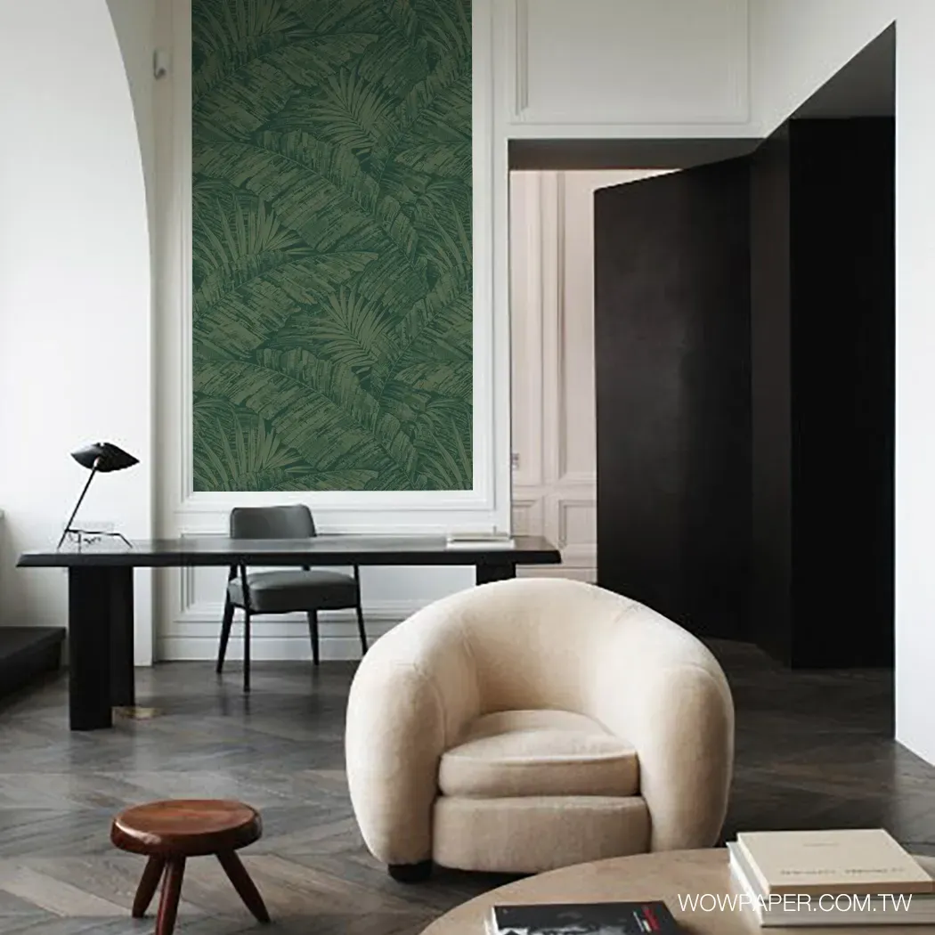 鉛筆筆觸描繪出這個層層疊疊的熱帶葉林,創造出具有現代設計的植物牆,富有動感的構圖融合於現代空間設計;面料使用無紡工法製造,透過質地較透氣以及纖維遇水不變形的特性來達到較防潮的機能性。