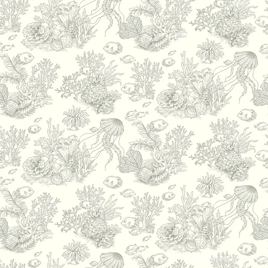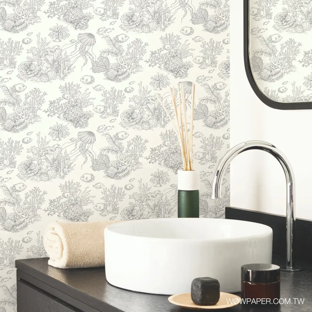 以異想天開的海底主題,重新詮釋傳統的朱伊印花布圖案。潛入珊瑚礁深處,將細緻的海洋生物與珊瑚交織出如夢似幻的水下世界;面料使用無紡紙搭配乙烯基膜製造,透過質地纖維遇水不變形以及表面的防水特性來達到較防潮和較耐刮的機能性。