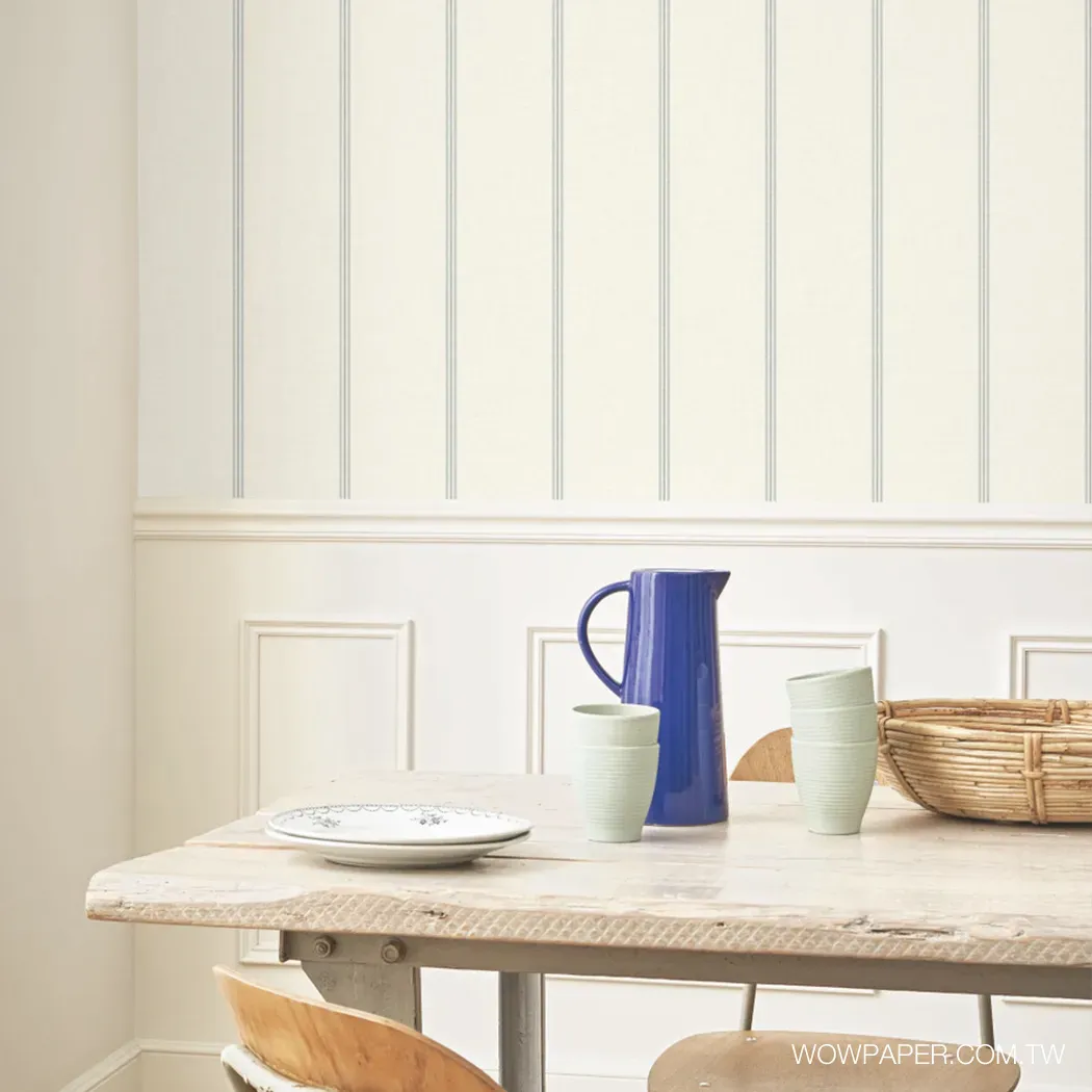 這款雙色條紋圖案設計靈感來自網球運動,永不過時的條紋設計搭配沿海風格的輕柔色調呈現,在輕織布紋上喚起優雅海濱度假村的氛圍;面料使用無紡紙搭配乙烯基膜製造,透過質地纖維遇水不變形以及表面的防水特性來達到較防潮和較耐刮的機能性。