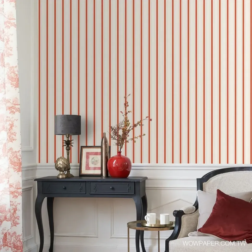 兩條細條紋搭配一條寬條紋的設計,柔和的色彩完美融合於法式典雅裝飾風格;面料使用無紡紙製造,透過質地纖維遇水不變形的特性來達到較防潮及較透氣的機能性。