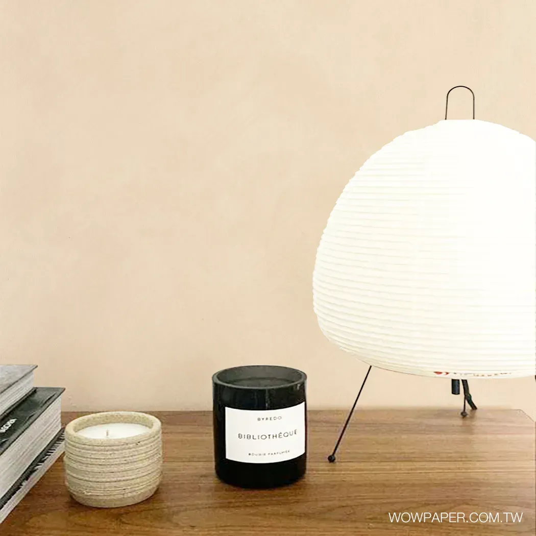 用自然刷色的泥灰抹牆紋理帶來溫暖與活力,適用於搭配各類設計風格的空間中;面料使用無紡紙搭配乙烯基膜製造,透過質地纖維遇水不變形以及表面的防水特性來達到較防潮和較耐用的機能性。