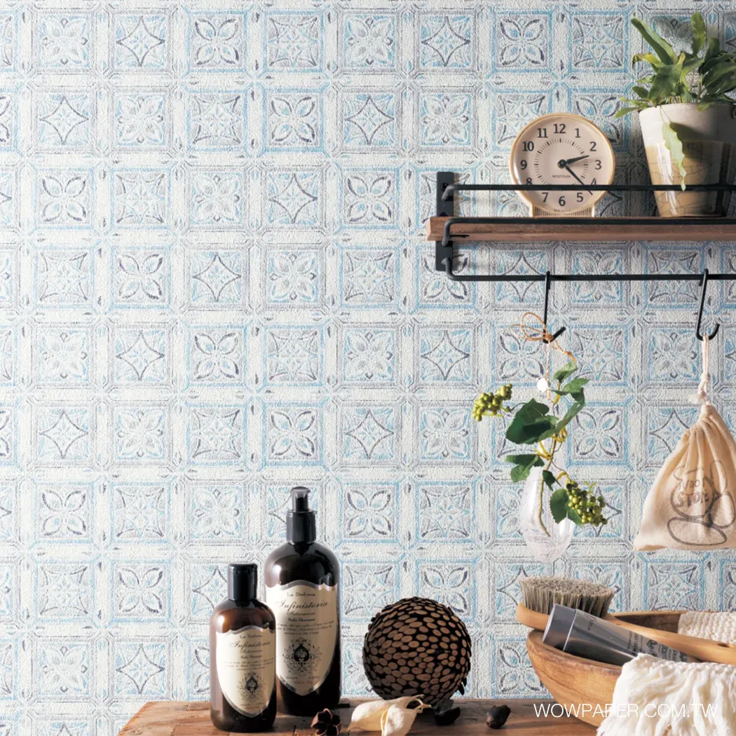 以白底細石紋為底材紋理,使用葡萄牙著名的彩磚工藝為設計,藍色手繪彩磚使室內空間帶著不平凡的異國氣息;此產品具備防霉塗層。