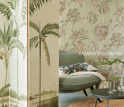 以平滑紋為底材紋理,用不同姿態的熱帶椰林為設計,搭配現代色彩打造摩登感的南洋風的悠閒;此款商品的底材使用無紡紙材製造,其纖維不受潮溼水氣影響。