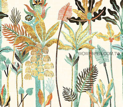 帶著鮮豔色彩的熱帶植草伴隨著舒適溫暖的微風,是哈瓦那迷媚奔放的花園景象,以粗織布紋為底材紋理,手繪感畫出鬱鬱蔥蔥的熱帶植草,和來自加勒比海的熱情;此商品使用無紡紙材製造,不受潮溼水氣影响。
