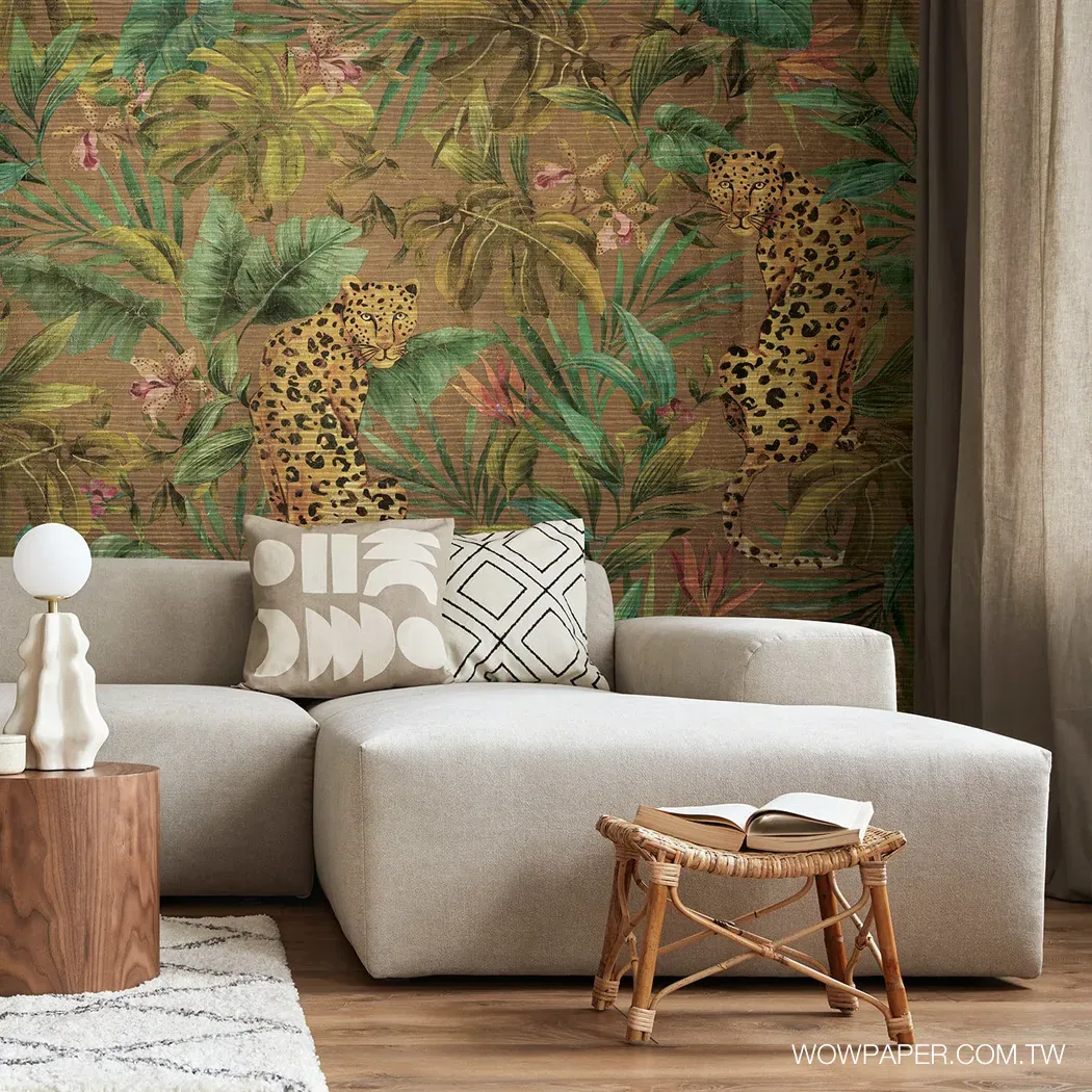 叢林的野豹躍動在異國風情在色彩中,古老的氣息如潮水般流淌,非洲的神秘在色彩中迴盪,搭配手作天然植纖織物面料底層襯著金色珠光帶來無可言喻的豐雅與詩意。