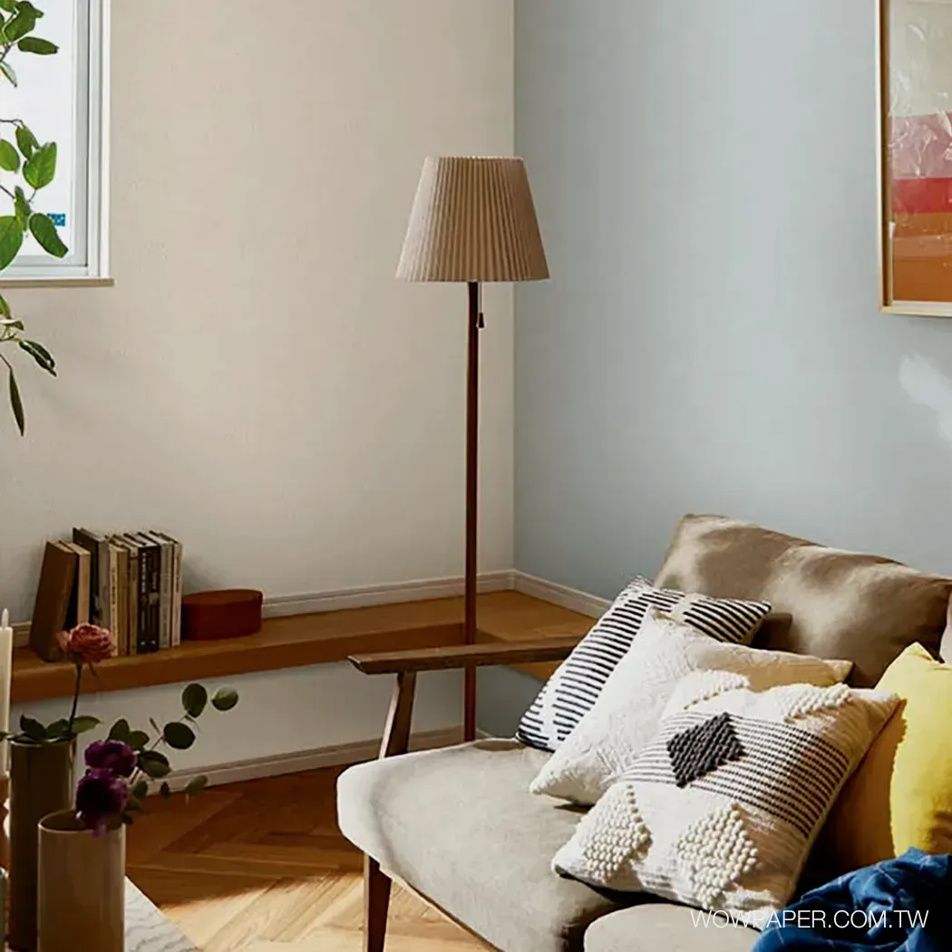 以質感細膩的立體刻紋打造霧光效果的肌理泥牆工藝,融合於現代風格的家居設計;此產品具備防霉抗菌塗層和「較抗裂」機能(當牆上產生細微裂縫時較不易撕裂壁紙)。