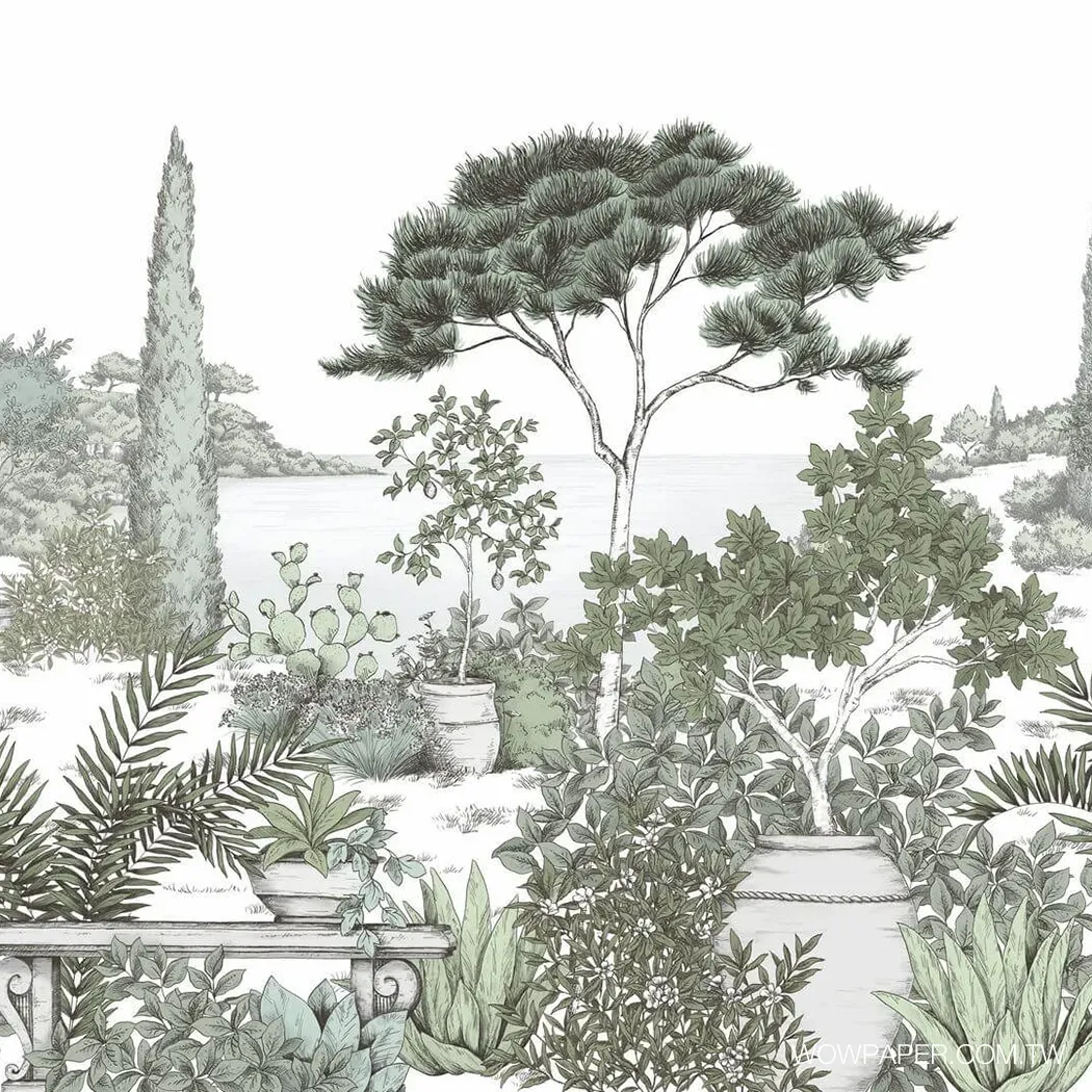 以棉紙紋為面料,精緻的墨水構圖描繪出面對蔚藍海岸的公園景色,異國情調的植物、安杜茲陶器和陰涼的庭院,在南方花園中讓人感到輕鬆自在。 面料使用無紡紙材製造,透過質地較透氣以及表面的防水特性來達到較防潮的機能性,在遇水後不易產生纖維變形等問題。