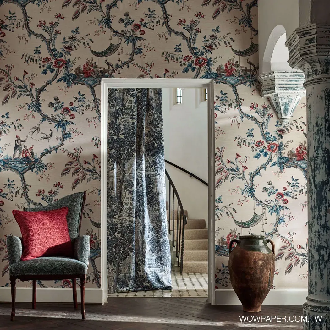 在精緻的紡織布面上,延伸的花藤在皇室的音樂家們周圍形成一個開放的圖騰,鳥兒和孔雀在一旁聆聽著美妙的音符,美麗的中國風場景啟發自18世紀的文件,大尺寸的對花設計,為空間帶來獨特而優雅的氣質。 透過紡織布面料以及底層的無紡紙材特性來達到較透氣的效果,其無紡紙材在遇水後不易產生纖維變形等問題。