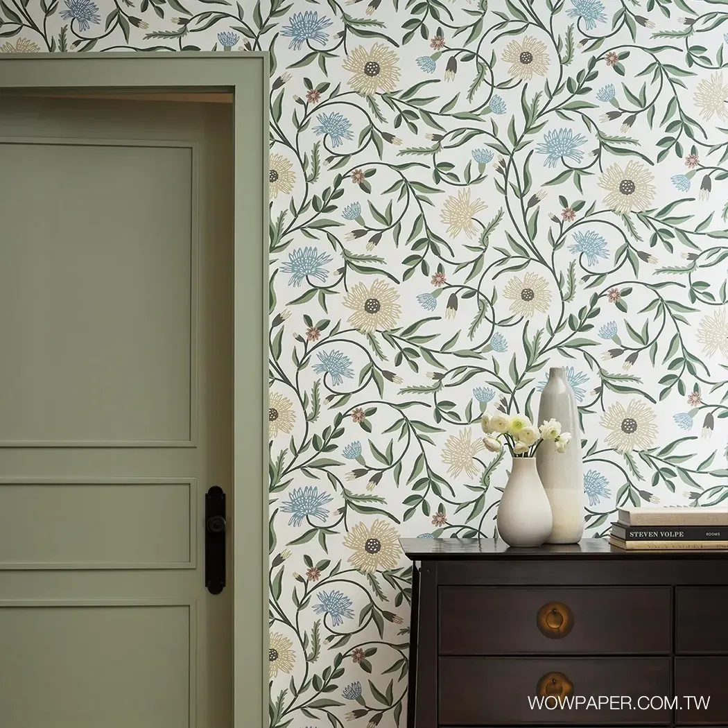 旋轉攀爬的莖上有著艷麗盛開的花朵,呈現出美式風格的優雅設計。面料使用平滑紋理無紡紙材製造,透過質地較透氣以及表面的防水特性來達到較防潮的機能性,在遇水後不易產生纖維變形等問題。